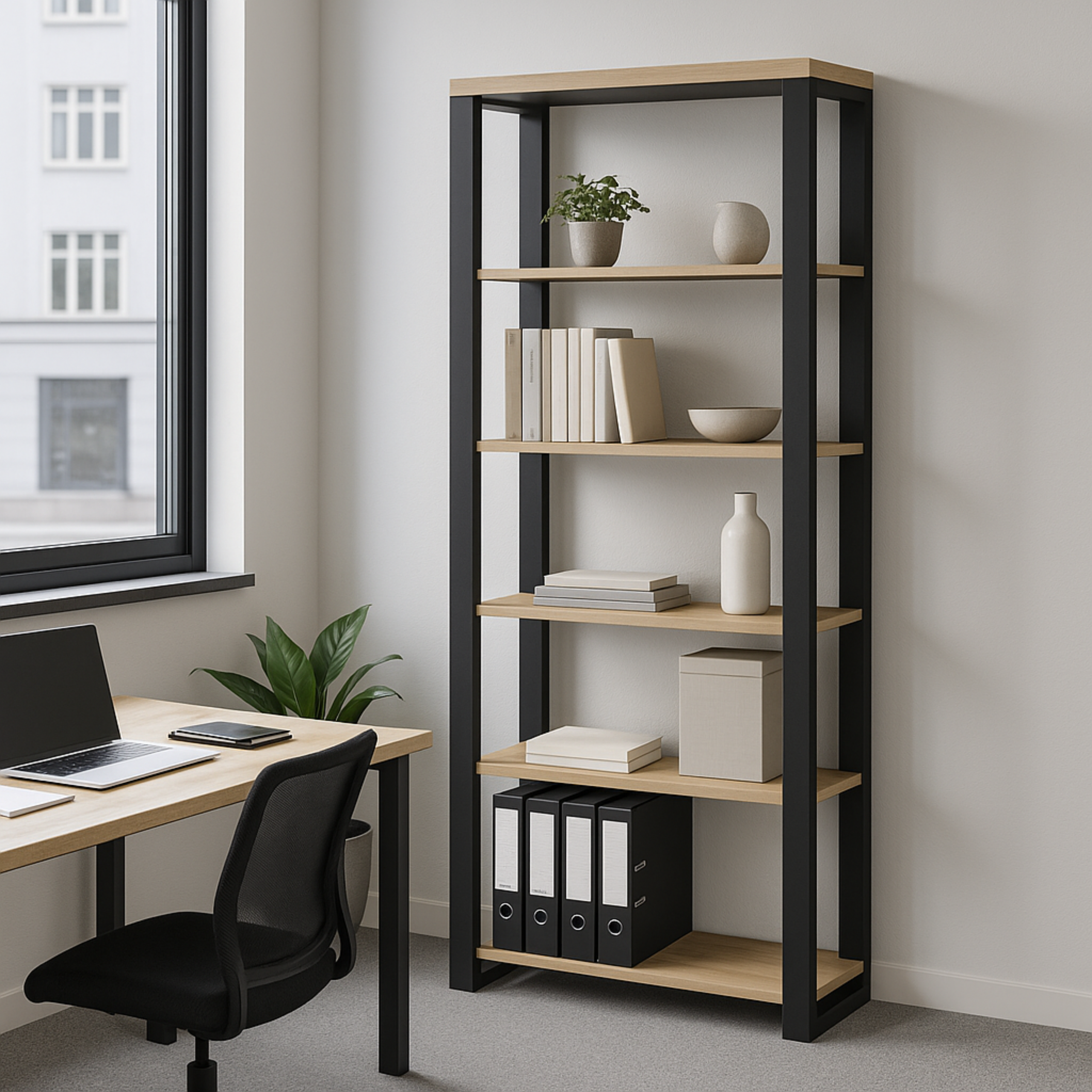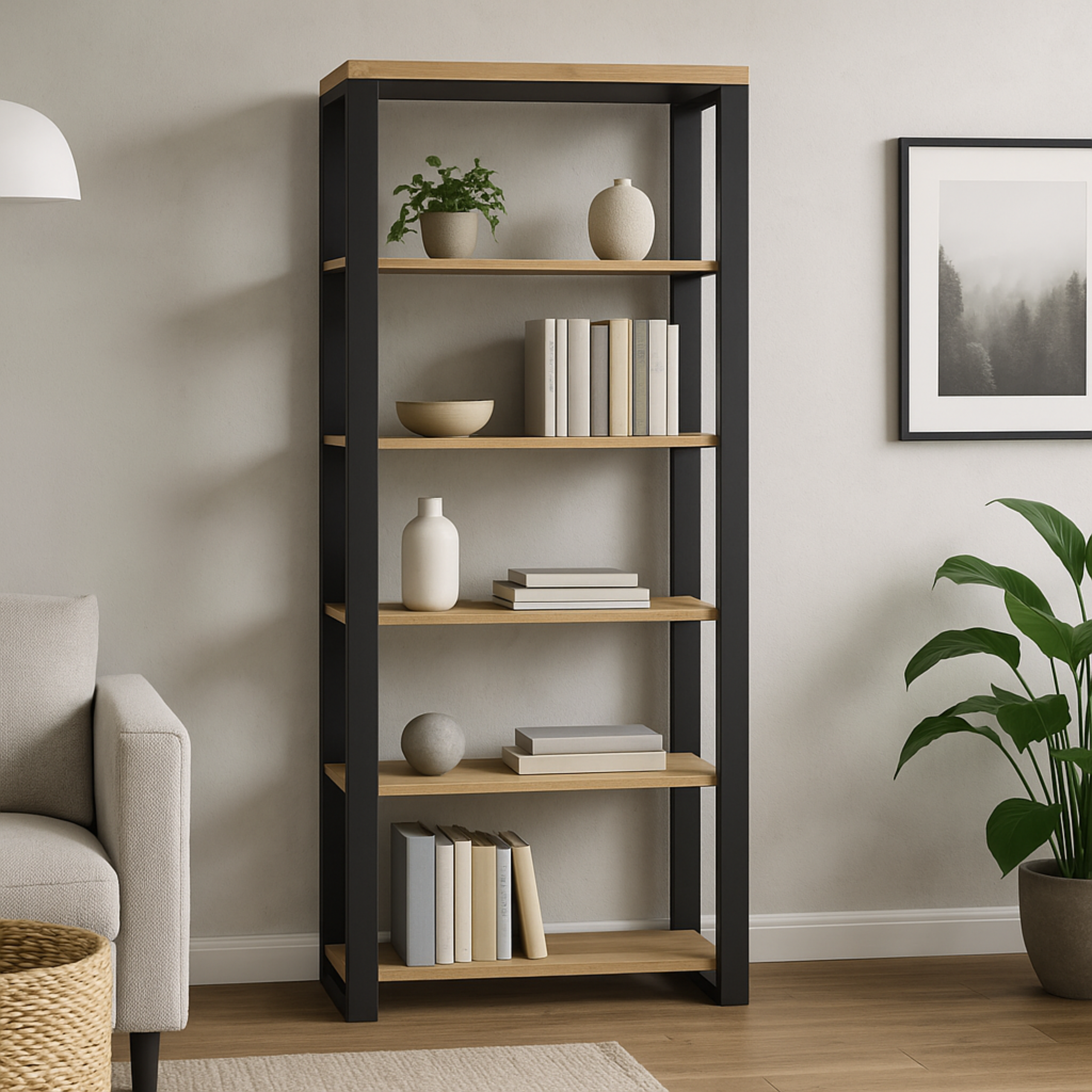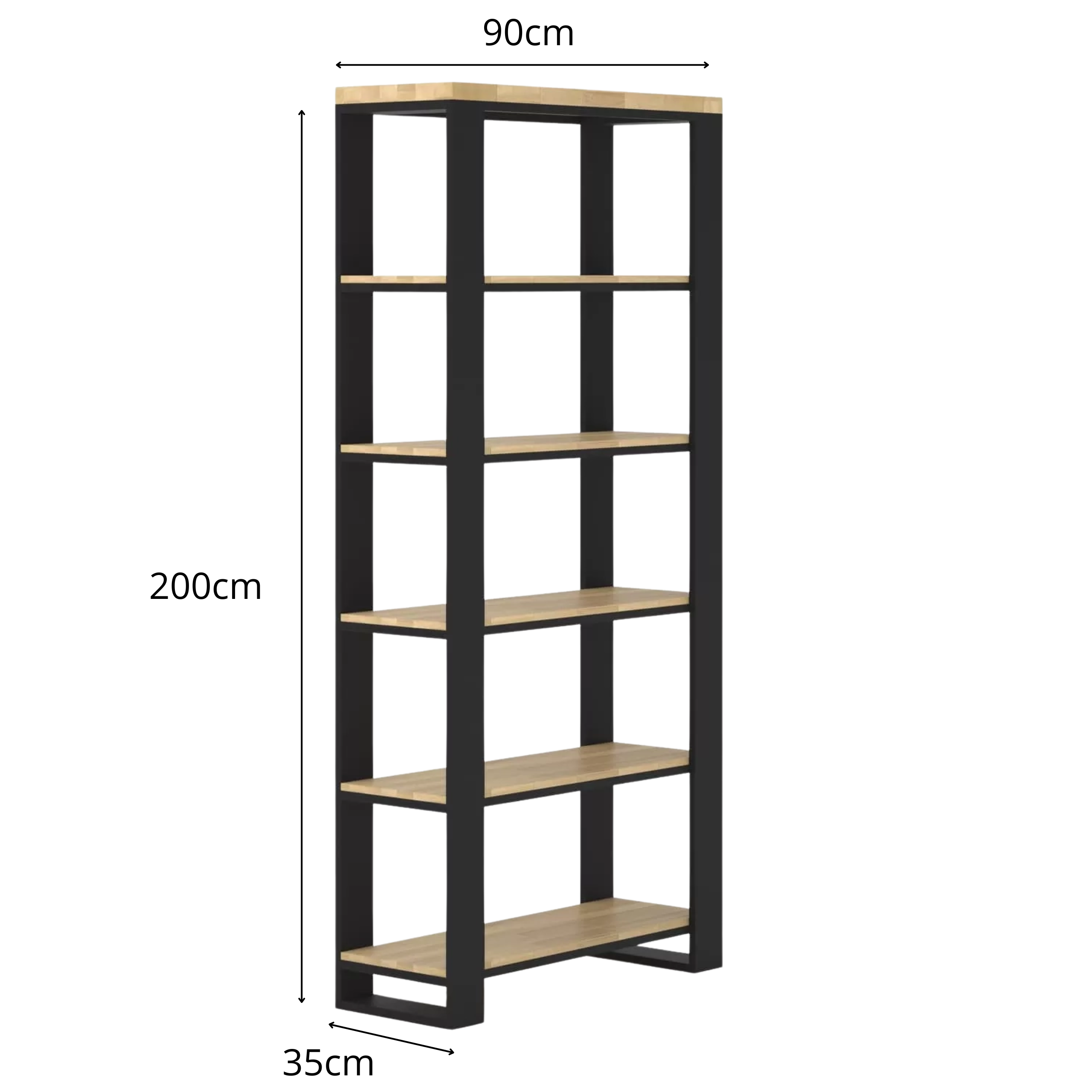 Solidny i elegancki regał dębowy. Dzięki proporcjom 90 × 35 × 200 cm świetnie sprawdzi się jako regał loftowy, regał do salonu, do gabinetu czy przestrzeni biurowej. Łączony na mikrowczep oraz metalowy stelaż malowany proszkowo na kolor czarny